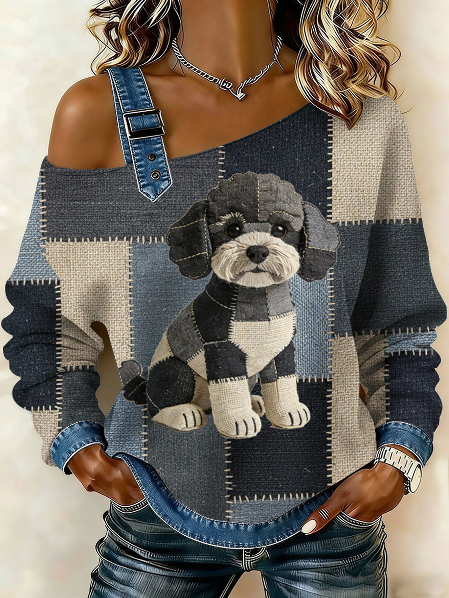 Women's Vintage Canvas Dog Patchwork Print Casual Off-Shoulder Sweatshirt