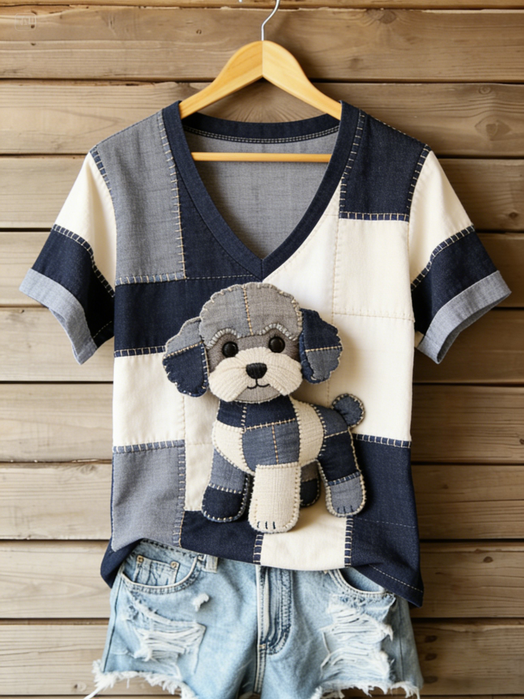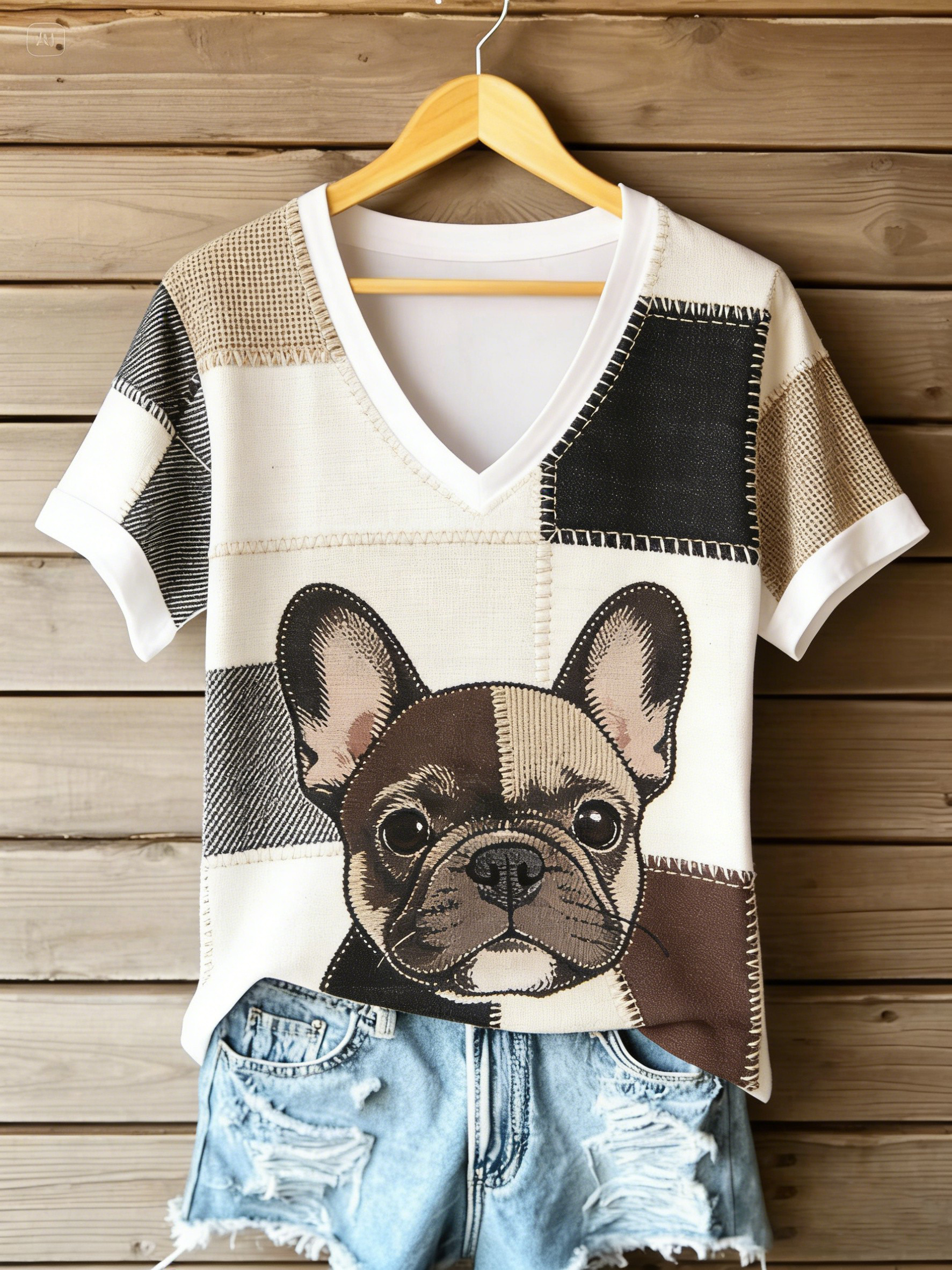 Women's Vintage Canvas Dog Patchwork Printed V-neck T-shirt