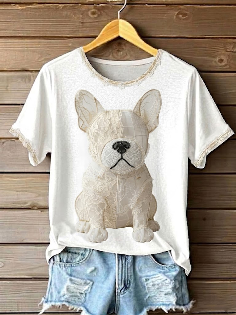 Women's Art Dog Lace Patchwork Printed T-shirt